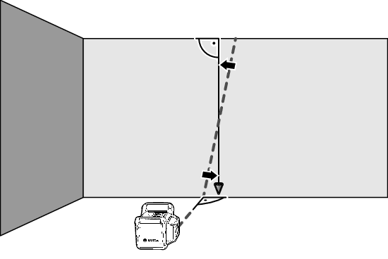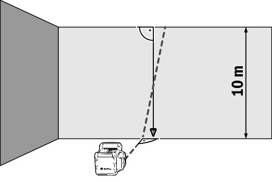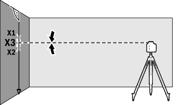以直擺方式將測量工具放置在穩固的平坦基座上。啟動測量工具,然後讓它進行水平面調整。調整測量工具位置,使可變雷射光束呈直角落於牆面上並且與鉛垂線相交。關閉測量工具。