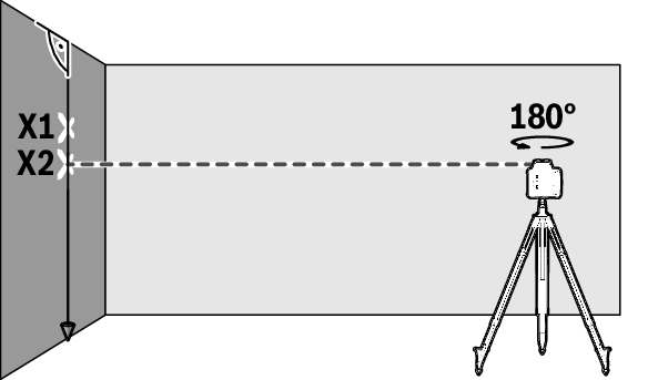 在牆上標出雷射光束的高度,此即為 X2 高度。此時,請您視需要使用雷射接收器 (37)。請注意:X2 高度應儘可能位於 X1 的正上方或正下方。
