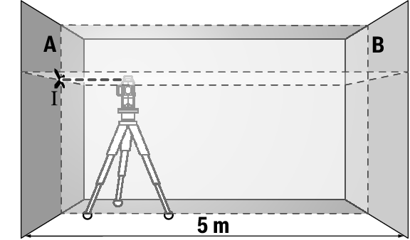 Für die Überprüfung benötigen Sie eine freie Messstrecke von 5 m auf festem Grund zwischen zwei Wänden A und B.