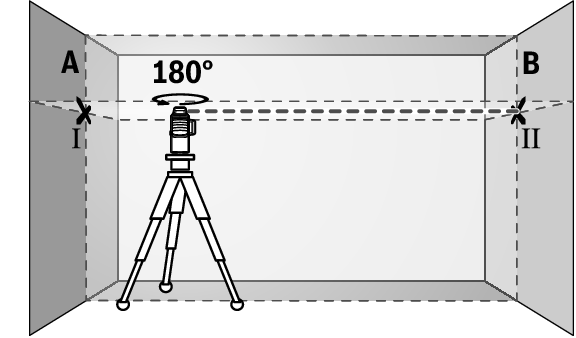- Drehen Sie das Messwerkzeug um 180°, lassen Sie es einnivellieren und markieren Sie den Kreuzungspunkt der Laserlinien an der gegenüberliegenden Wand B (Punkt Ⅱ).