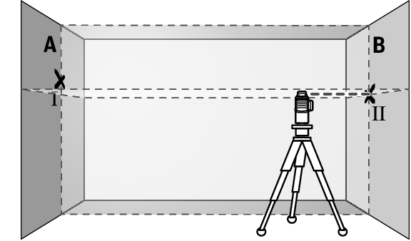 - Richten Sie das Messwerkzeug in der Höhe so aus (mithilfe des Stativs oder gegebenenfalls durch Unterlegen), dass der Kreuzungspunkt der Laserlinien genau den zuvor markierten Punkt Ⅱ auf der Wand B trifft.