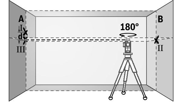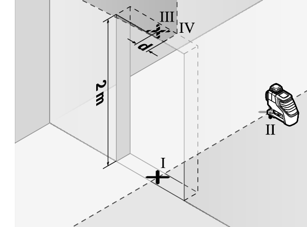 - Die Differenz d der beiden markierten Punkte Ⅰ und Ⅲ auf der Wand A ergibt die tatsächliche Höhenabweichung des Messwerkzeugs.