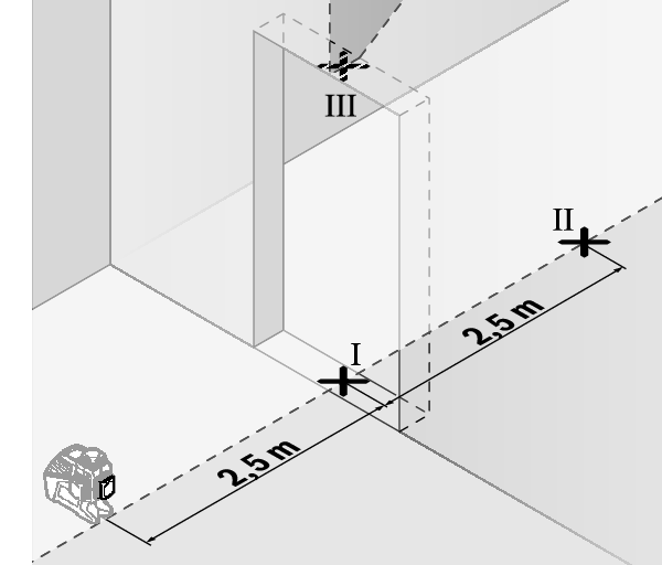 - Markieren Sie die Mitte der senkrechten Laserlinie am Boden der Türöffnung (Punkt Ⅰ), in 5 m Entfernung auf der anderen Seite der Türöffnung (Punkt Ⅱ) sowie am oberen Rand der Türöffnung (Punkt Ⅲ).