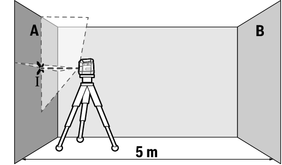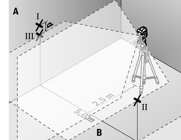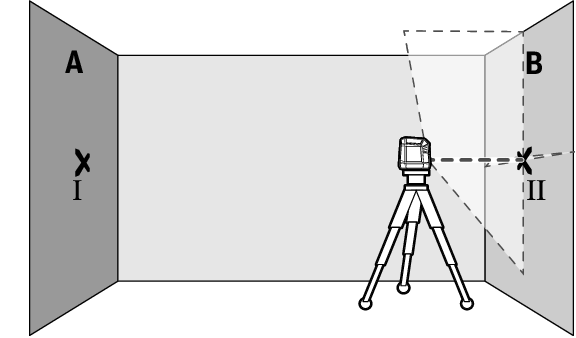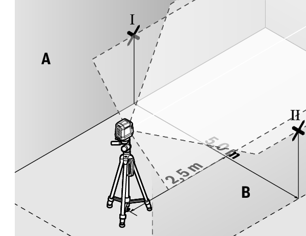 • 在距测量仪2.5米的两墙上标记激光线的中心(在墙A上标记点Ⅰ,在墙B上标记点Ⅱ)。