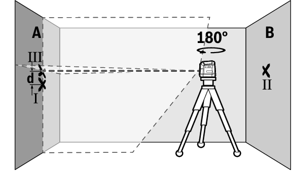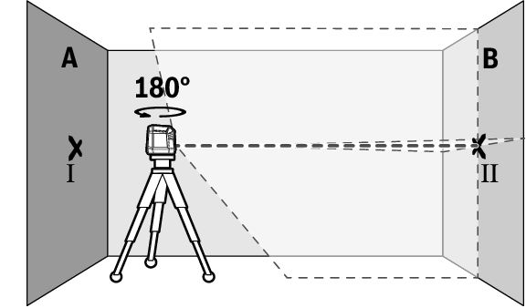 • 将测量仪旋转180°,找平,然后在对面的墙B上标记激光束的交叉点(点Ⅱ)。