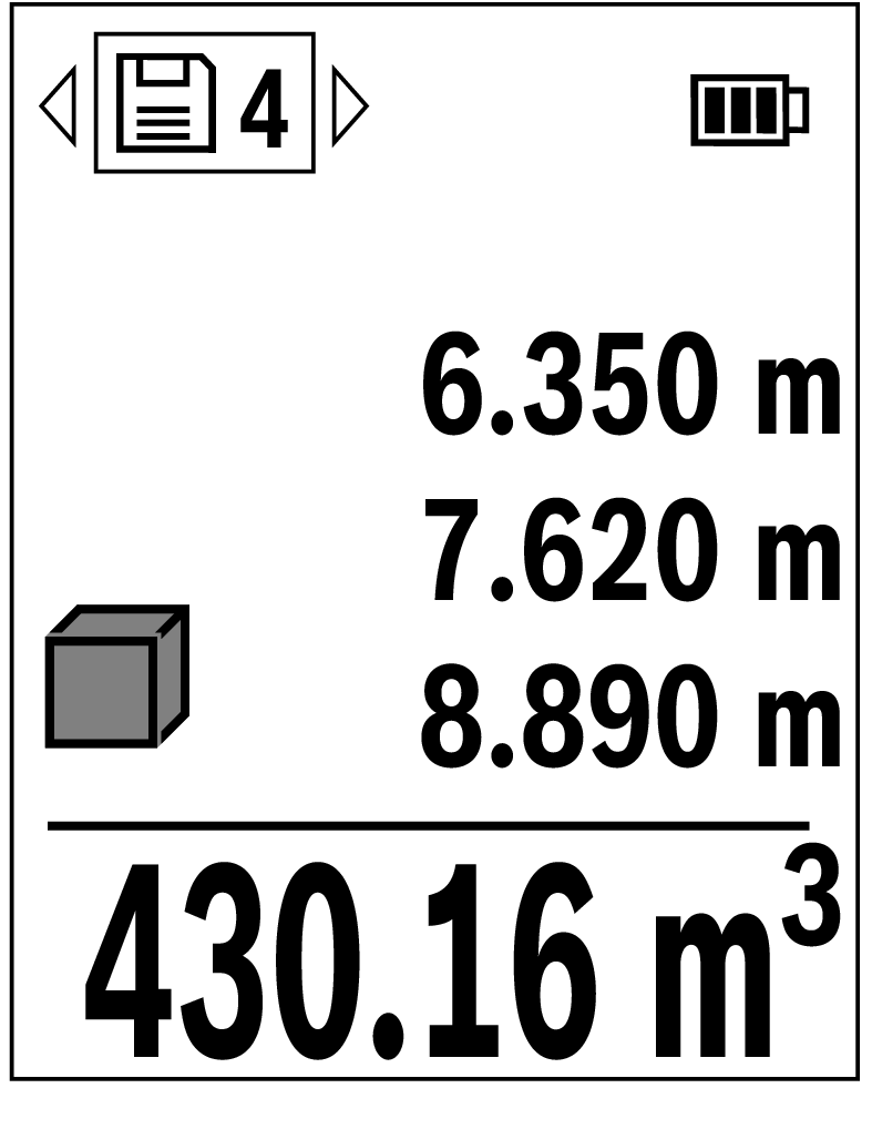 显示屏上部显示保存值的编号,左侧显示相应测量功能的图标。如果存储器中没有数值可用,则显示屏下部显示“0.000”而上部显示“0”。