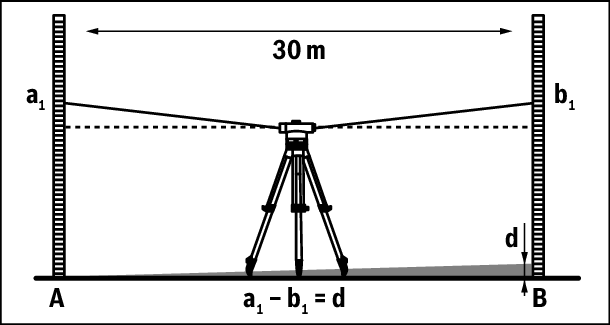 针对这项检测,需要大约30米长的测量距离。将测量仪放在中间,水准尺AB放在测量距离的两端。