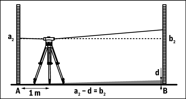 对准并对焦测量仪后,读取两个水准尺上的高度。计算水准尺A上的高度a1与水准尺B上的高度b1之间的差值d