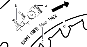 | a Prečnik lista testere sme da iznosi maksimalno 216 mm. b Prilikom zamene lista testere, vodite računa o tome da širina sečenja ne sme da bude manja od 1,7 mm, dok debljina osnovnog lista ne sme da bude veća od 1,5 mm. U suprotnom, postoji opasnost da se rascepni klin zakači za radni komad. c Debljina rascepnog klina iznosi 1,6 mm. d Smer presecanja zubaca (smer strelice na listu testere) mora da se poklapa sa smerom strelice na rascepnom klinu. |