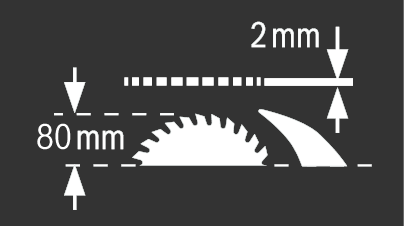 | a 允许的最大锯片直径为254毫米。 b 劈开楔的厚度为2毫米。 c 锯齿的方向箭头(锯片上的箭头方向)必须和劈开楔上的箭头方向一致。 d 更换锯片时,请确保切割宽度不小于2.4毫米,锯片主体的厚度不大于1.8毫米。否则劈开楔(毫米)可能卡在工件中。 |